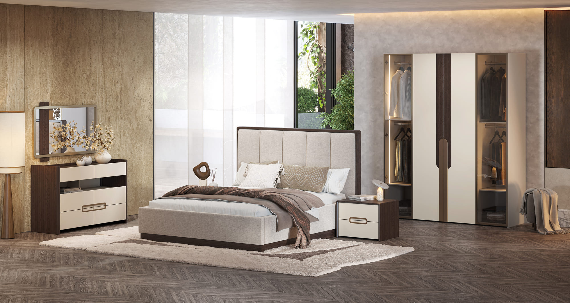 Фасад: МДФ толщиной 22 мм (МДФ - древесноволокнистая плита среднего уровня плотности, класс E1 - безопасен для здоровья). Тонированное стекло в алюминиевой рамке золото. Цвет фасадов: венге, крем