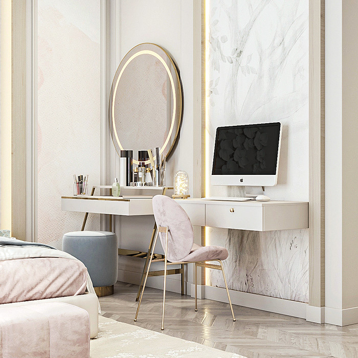 Находиться в пастельном интерьере легко и спокойно. Спальня выглядит изящно и нежно с кроватью и мягкой обивкой. Высокая спинка создает ощущение комфорта, а текстиль — уюта. Отличным дополнением такого дизайна стал туалетный столик, который можно использовать для декора или личных вещей.