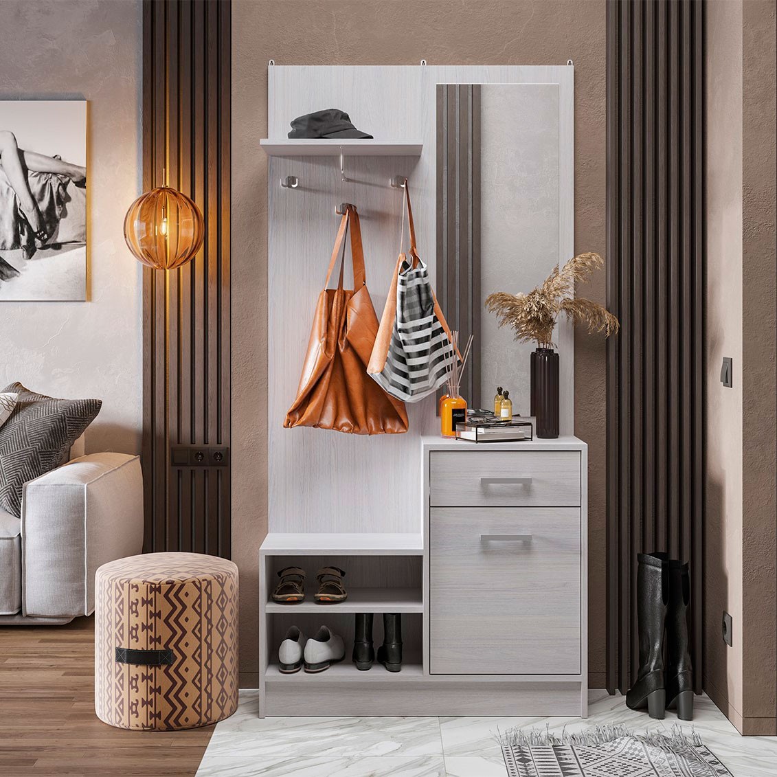 Прихожая имеет современный дизайн.